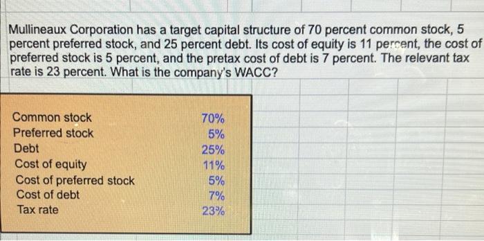 Solved Mullineaux Corporation Has A Target Capital Structure Chegg Com